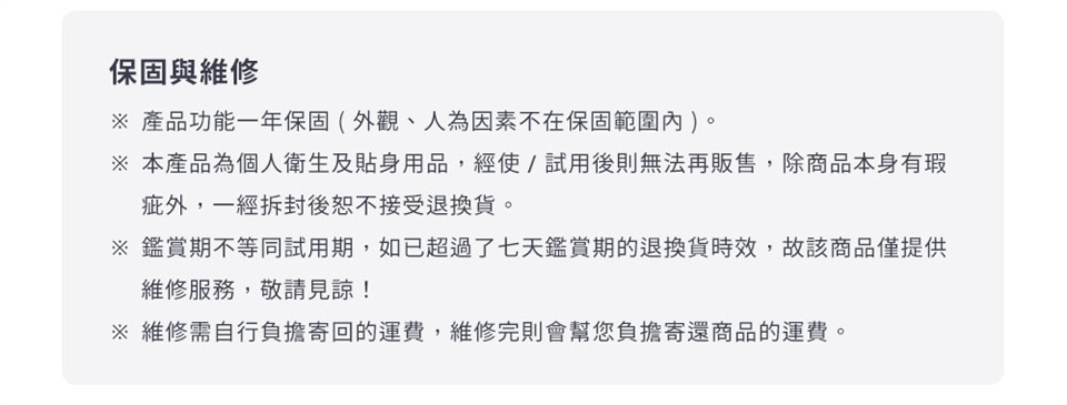 ※ 本產品為個人衛生及貼身用品,經使 / 試用後則無法再販售,除商品本身有瑕疵外,一經拆封後恕不接受退換貨。