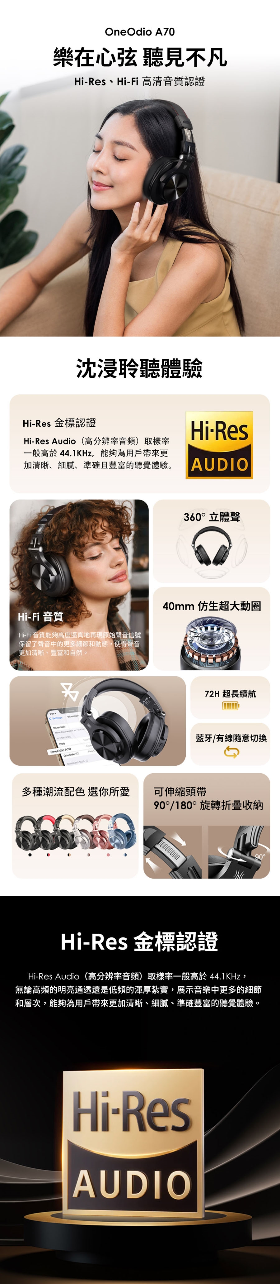 - 專業音質|HI-Res認證,高保真監聽品質