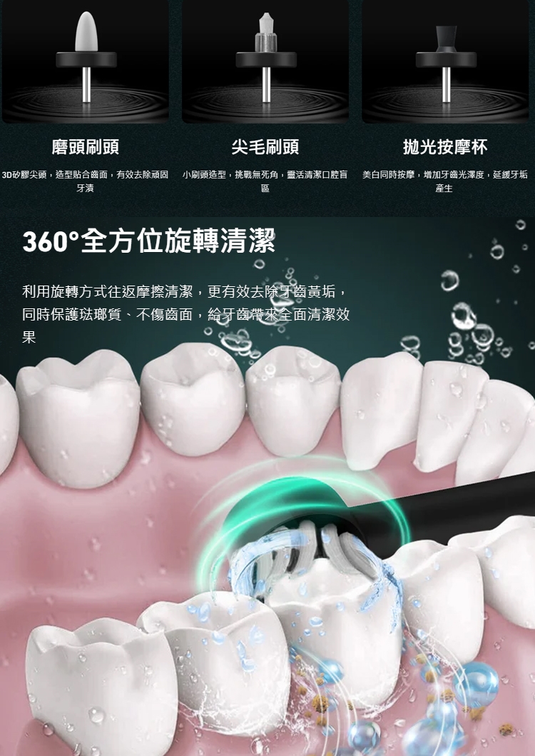 專為滿足各種口腔清潔需求而設計,針對頑固牙漬而生。四種專業刷頭各具特色,能輕易達成許多電動牙刷無法滿足的需求,不只清潔、更能進一步達到拋光美白的功效。