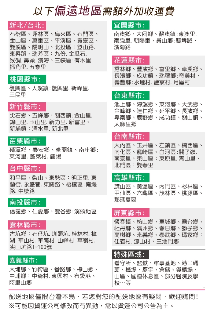 ◎配送範圍僅限臺灣本島,偏遠地區需依情況加收費用,若有問題請先詢問客服。