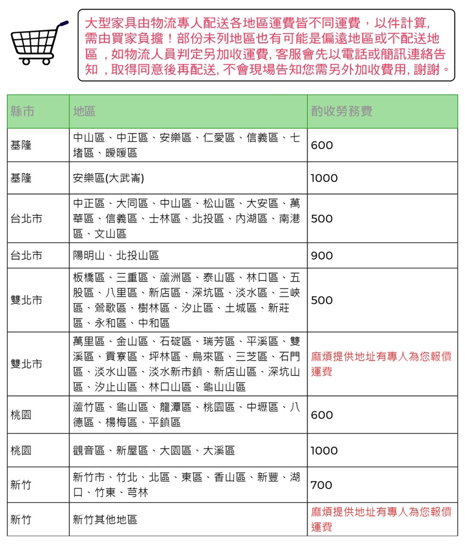 5.大型傢俱類、實因特殊地型限制偏遠山區、鄉鎮無法送貨時,本公司保有出貨與否權利