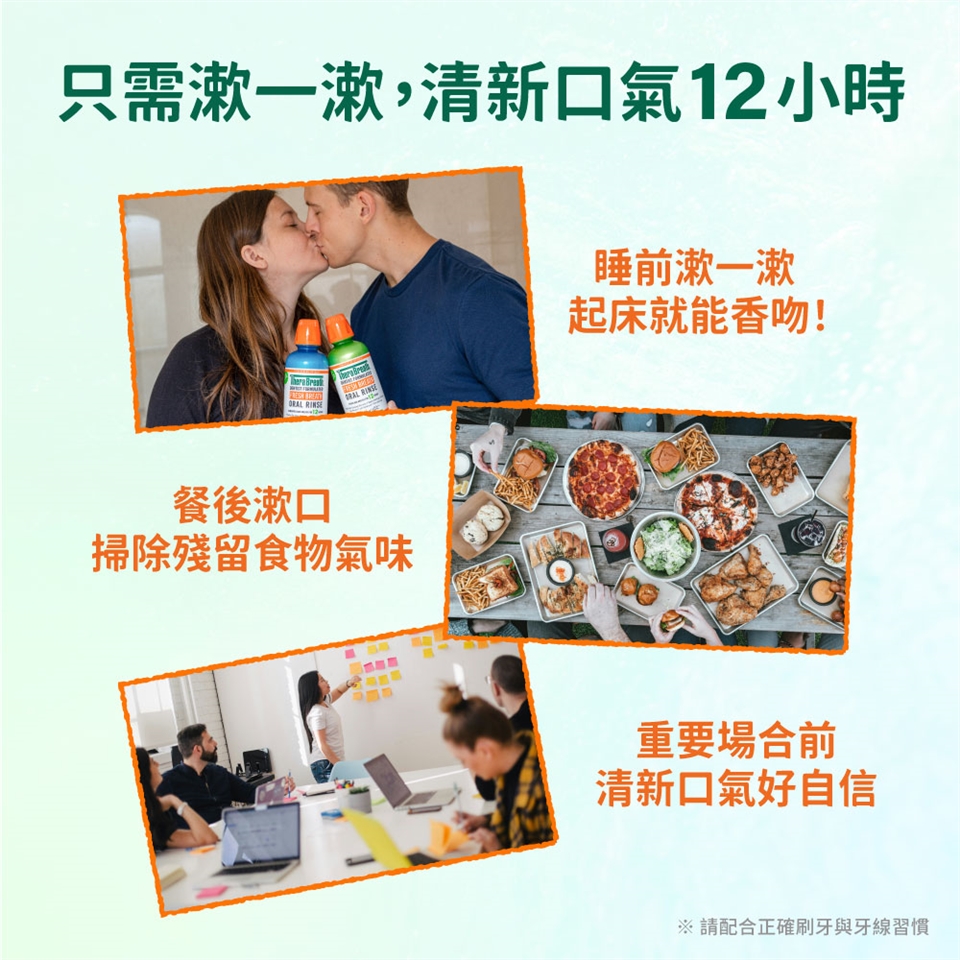 請放置於12歲以下孩童無法觸及之處。僅依標籤上的「用法」使用。如不慎吞嚥超過漱口使用量,請立即就醫或聯繫毒物控制中心。請勿與含氯酸鹽的其他產品一起使用。如不慎灑在織物上,請立即清洗。如果封口破損或遺失,請勿使用。2歲以下孩童使用前請諮詢醫師或藥師。