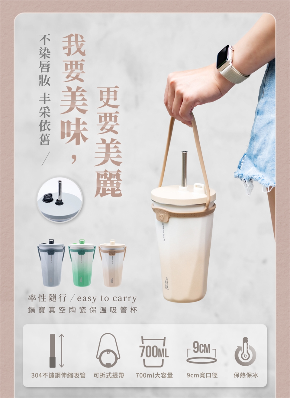 品名:鍋寶真空陶瓷保溫吸管杯型號:SVCT-698G材質:內膽/304不鏽鋼+釉黑陶瓷層 杯身/304不鏽鋼+磨砂烤漆層 杯蓋+吸管防塵蓋/PP(耐熱120℃) 吸管/304不鏽鋼+矽膠(耐熱200℃)滿水容量:約700ml±5%有效容量:約600ml±5%重量:約328g±5%商品尺寸:約總長10×寬10×高19cm±5% 數量:乙只入
