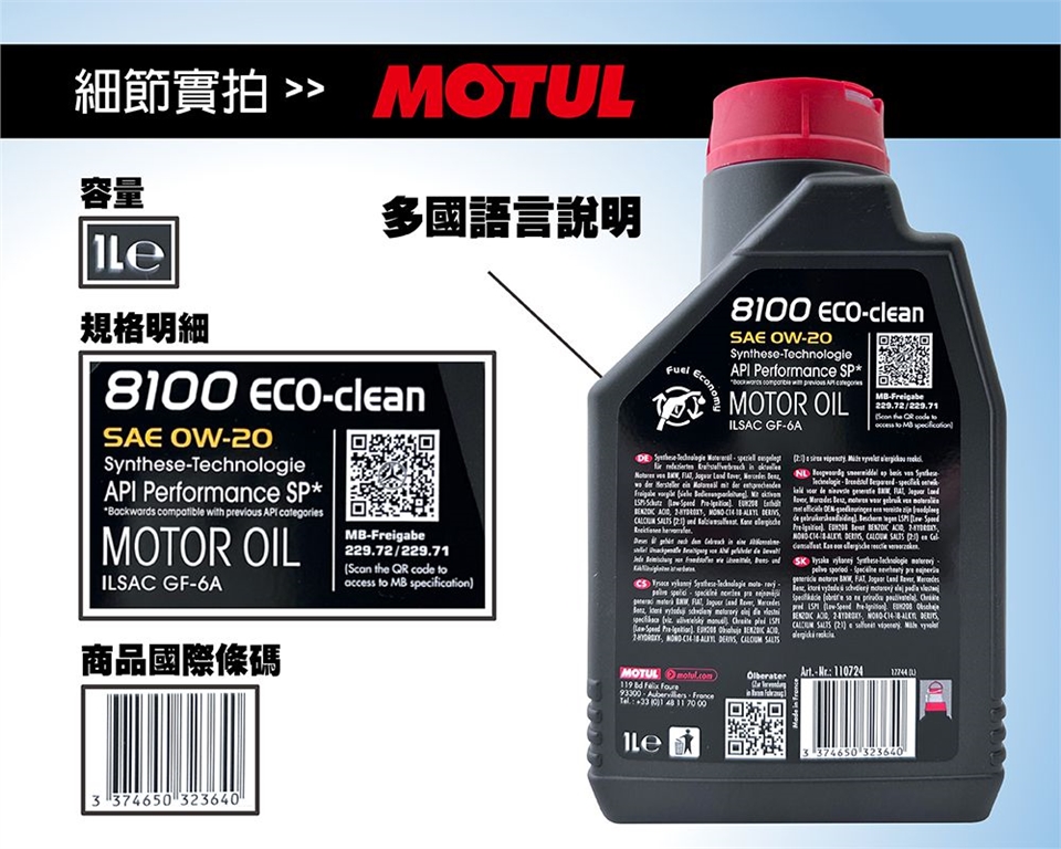 MOTUL 8100 ECO-CLEAN 0W-20 是一款全合成節能機油,專為符合歐盟四期、五期和六期排放標準的汽油和柴油發動機設計,包括配備缸內直噴、渦輪增壓和汽油微粒濾清器 (GPF) 的發動機。它符合 ACEA C5、API SP 等嚴苛的性能標準。