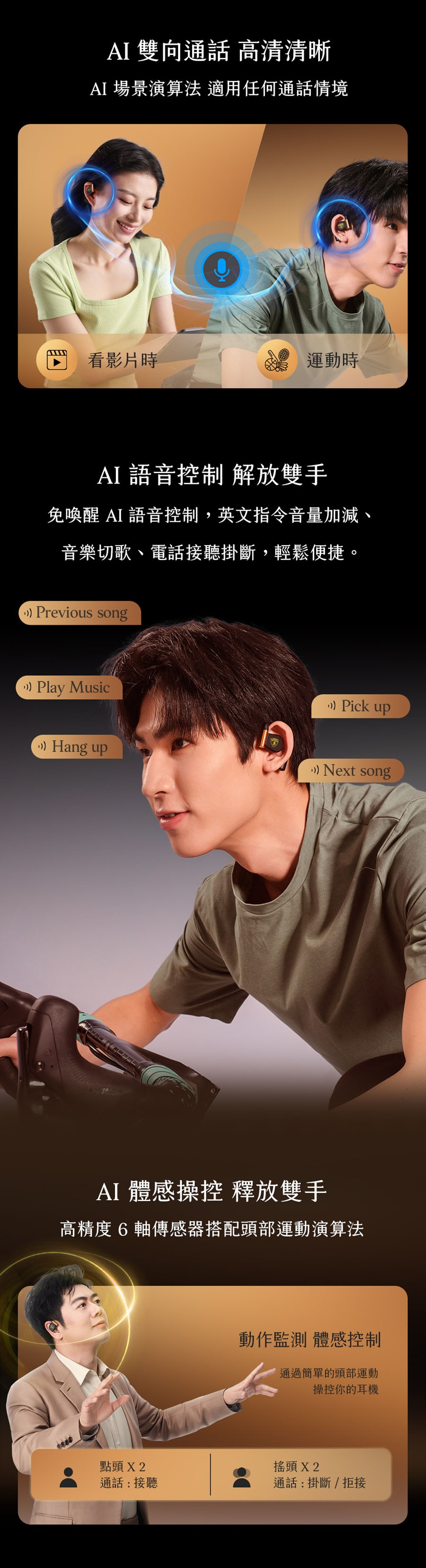 操控模式:觸控 / 體感 / 語音 控制耳機 (點頭 / 搖頭)