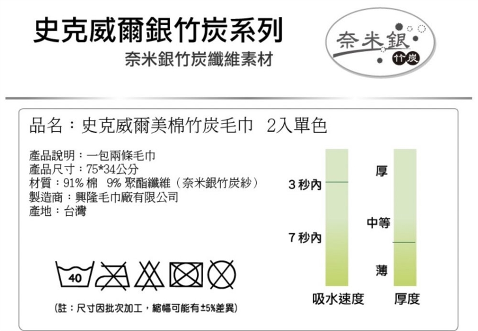 產品名稱:奈米竹炭紗.史克威爾美國棉毛巾