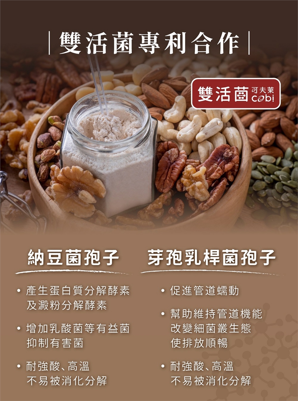 胡桃、雙活菌(燕麥粉、納豆菌發酵物、芽孢乳酸菌發酵物、麥芽糊精)
