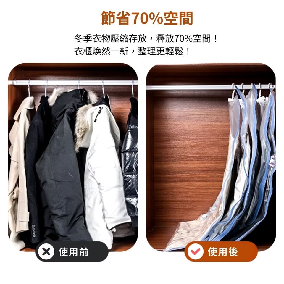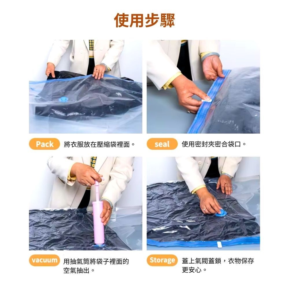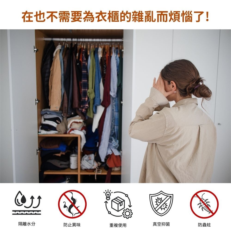 真空密封有效防塵、防潮、防霉味、抗泛黃,讓您的衣物乾淨如新、整齊有序,輕鬆收納一目瞭然!