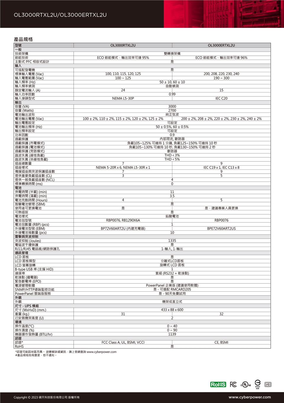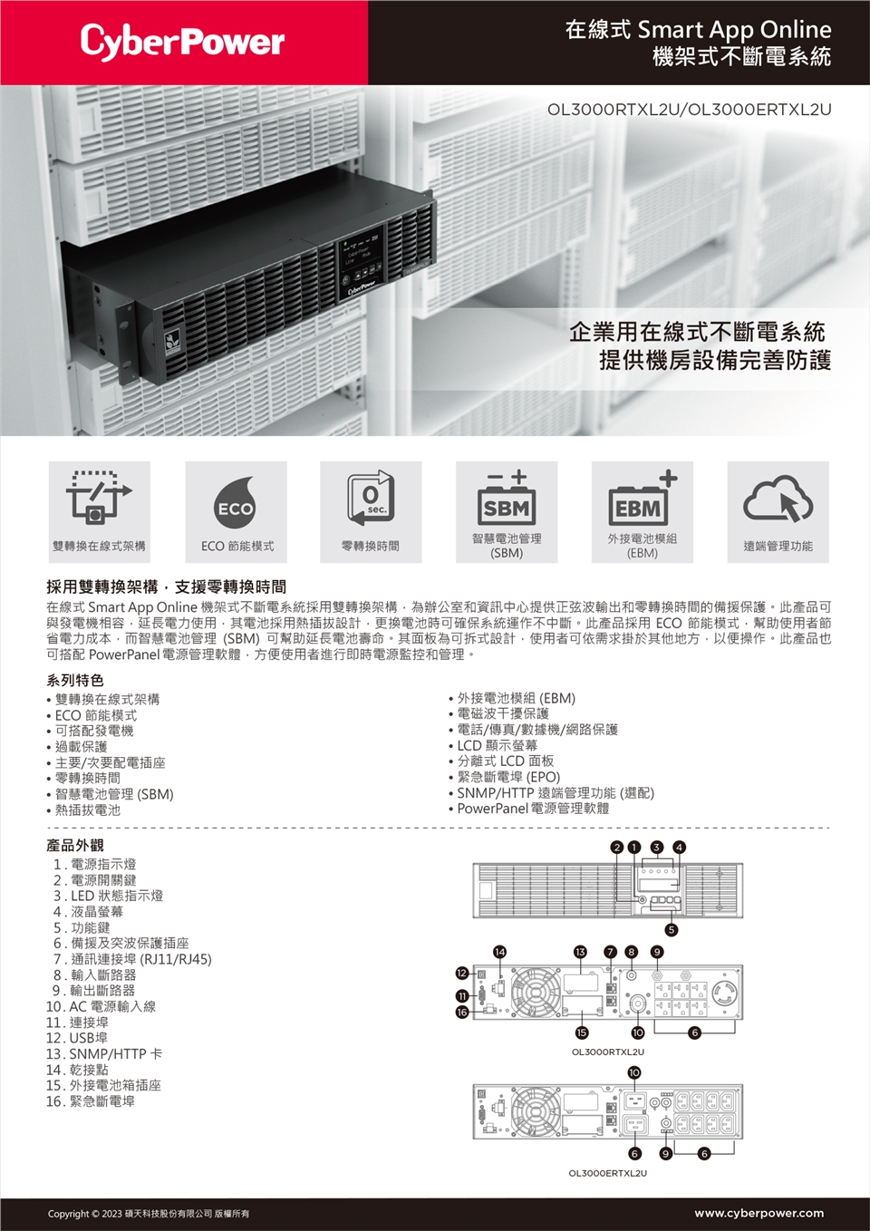 CyberPower OL3000RTXL2U 為 IT 設備、伺服器、工作站、NAS 儲存裝置、網絡設備,安全系統和監控系統提供電力備援保護。此產品為在線式不斷電系統,提供高品質電力輸出,其節能模式可有效節省電費。此產品可與發電機相容,延長電力使用,其電池採用熱插拔設計,更換電池時可確保系統運作不中斷,並具備緊急斷電埠 (EPO),在緊急事件發生時,可立即關閉不斷電系統電源。 此產品採用智慧電池管理 (SBM),可提升電池充電性能,並延長電池壽命,節省電池維護成本。其面板為可拆式設計,使用者可依需求掛於其他地方,以便操作,而內建的 RJ11/RJ45 埠則保護連接設備不受突波損害。此產品也可搭配 PowerPanel 電源管理軟體,方便使用者進行即時電源監控和管理。