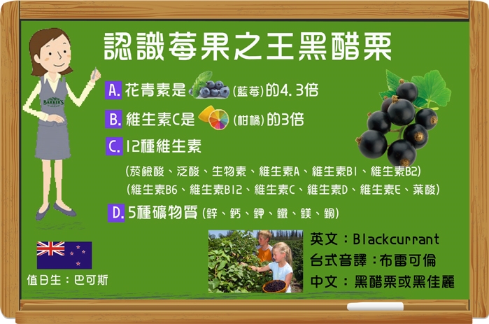 添加來自紐西蘭天然鮮榨黑醋栗精華、綜合莓保健鮮果汁和全葡萄萃取物,