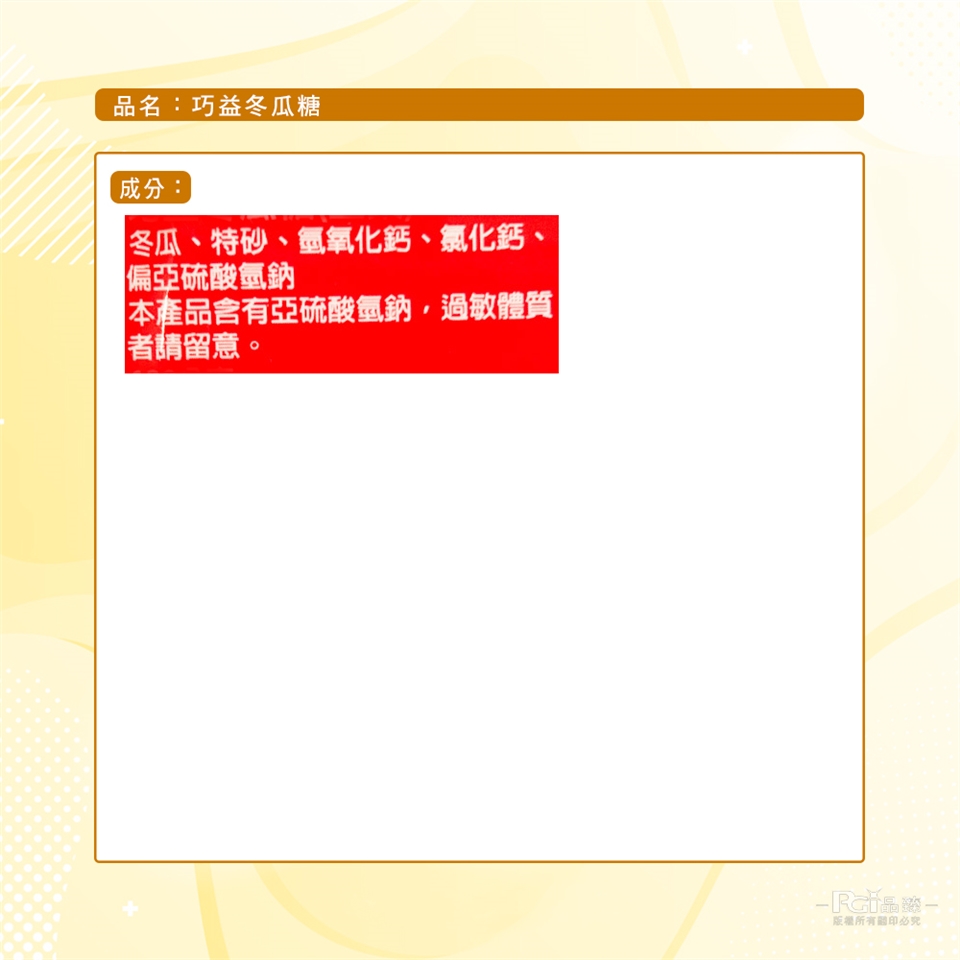 冬瓜糖:本產品含有亞硫酸氫鈉,過敏體質者請留意。