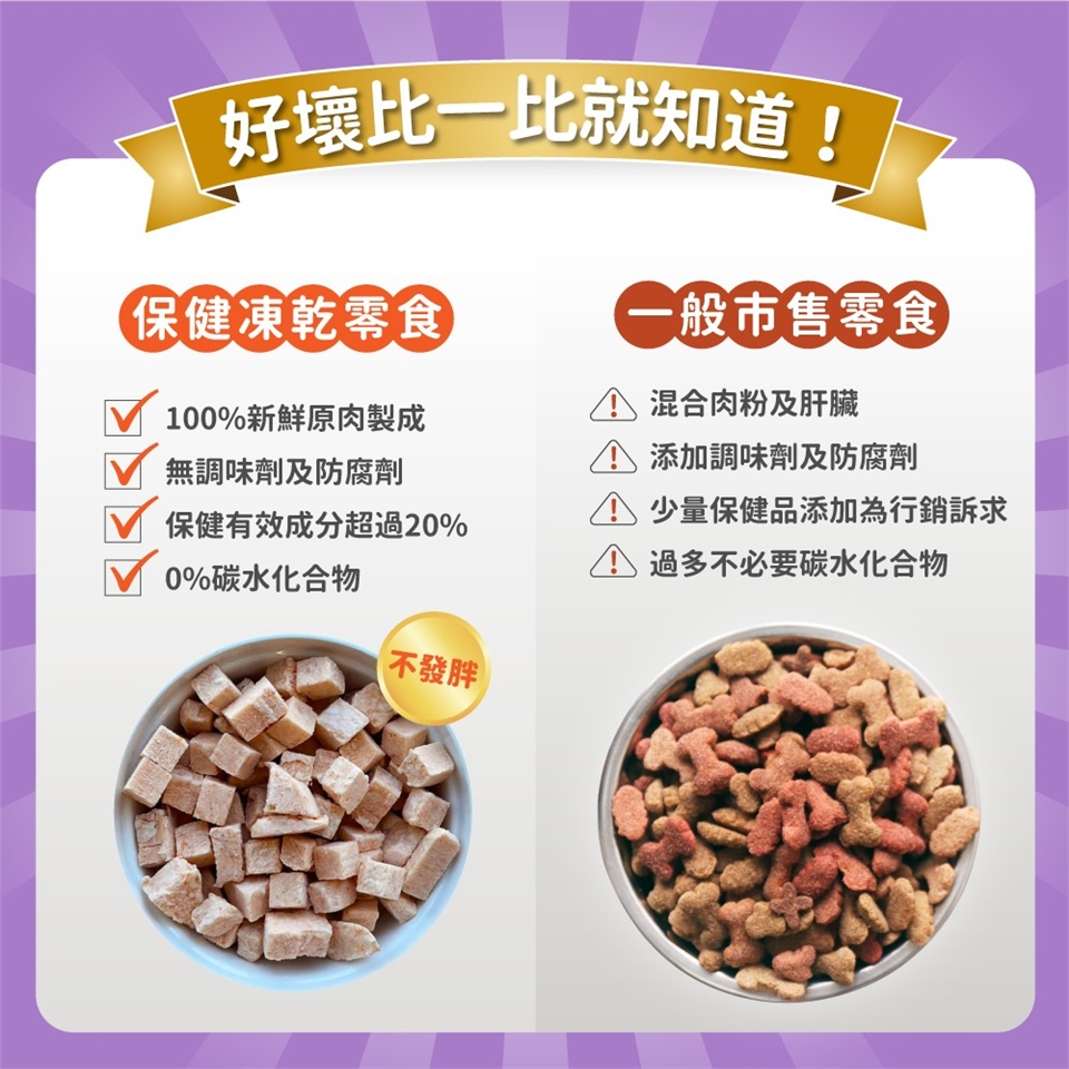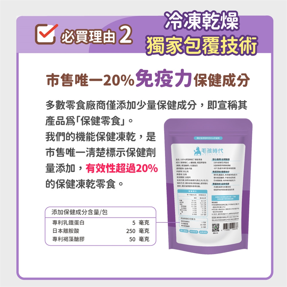 👉毛孩時代的凍乾零食,保健成分有效性高達20%,是市場上保健營養成分最高的寵物零食。如果凍乾不是每天大量食用(亦不建議每日大量攝取凍乾零食,可能因為吃不下其他食物造成營養不均衡),較難吃到每天建議保健食品用量。因此,為了達到保健健康需求,建議可以另外搭配保健食品。