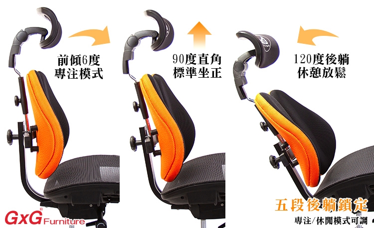 5段鎖定前傾6度一段、90度直角坐正、放鬆後躺3個段落鎖定,後躺最大角度約40度。