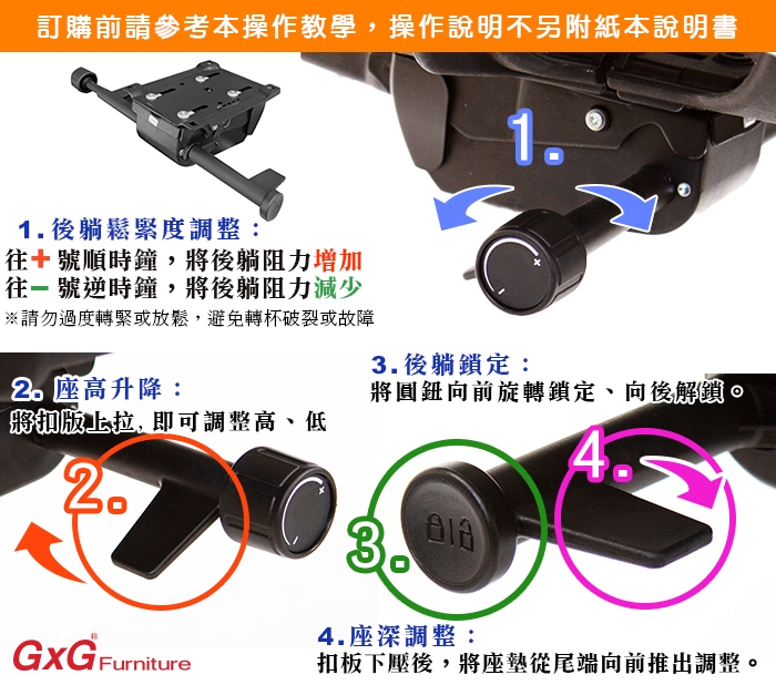 1.後躺鬆緊度調整:透過座墊右邊『轉頭桿』,旋轉調整,往(-)減號可讓後躺鬆緊不用麼費力,或是朝(+)加號順時鐘轉,可增加後躺阻力緊度,不讓後躺速度那麼快。