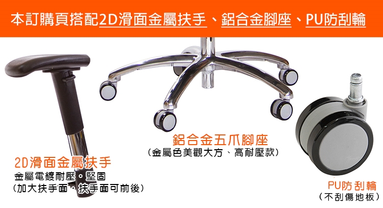 本訂購頁規格:2D滑面金屬升降扶手、鋁合金腳座、PU防刮滑輪