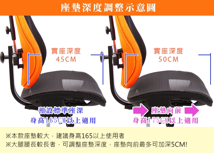 本款TW-3676系列,可調整座墊深度,能向前增加座深5cm間距,實座深度45-50CM,身高較高者,能配合腿長調整,讓高個子也能使用的舒適。