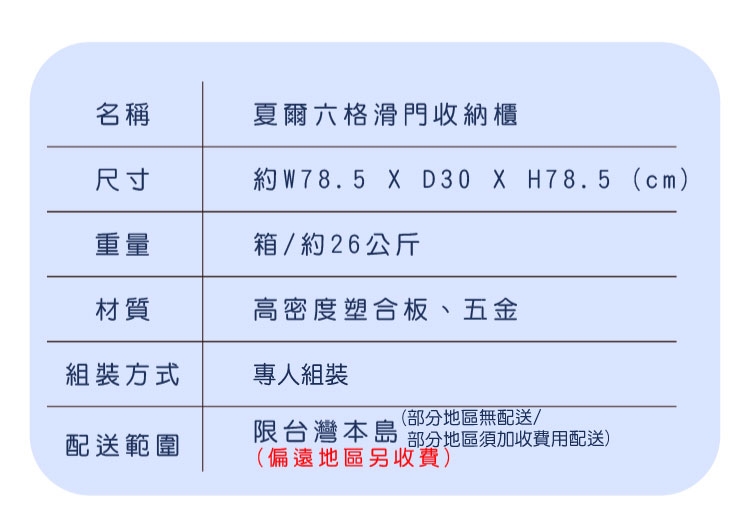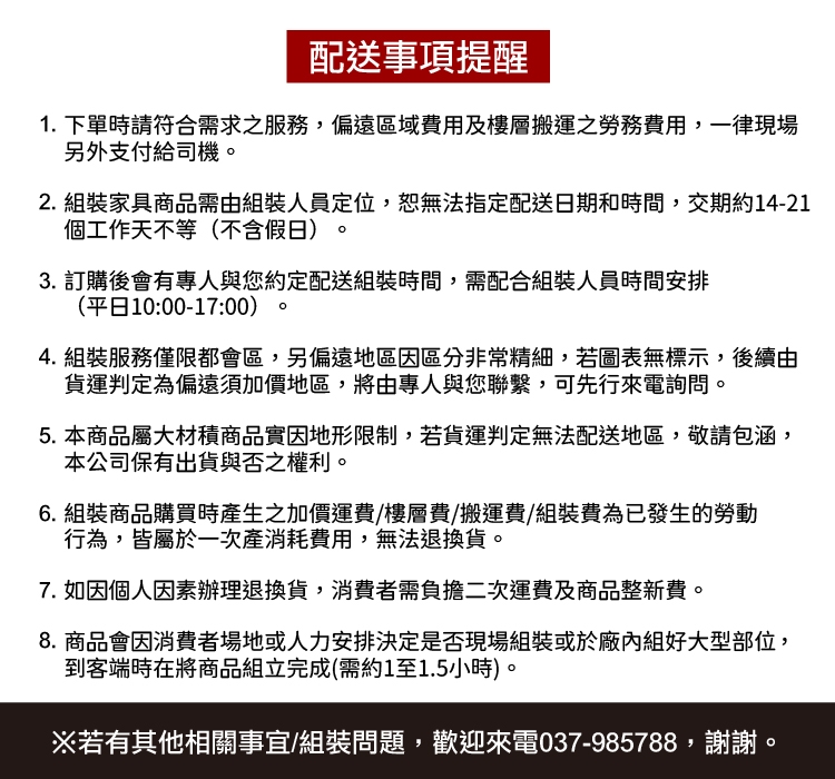 4.組裝服務僅限都會區,另偏遠地區因區分非常精細,若圖表無標示,後續由貨運判定為偏遠須加價地區後,將由專人與您聯繫,可先行來電詢問。