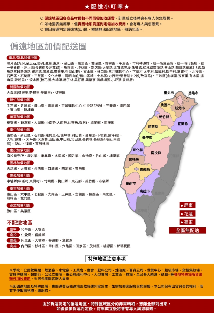 –實因地形限制,若無法配送地區,敬請包涵,本公司保有出貨與否之權利。