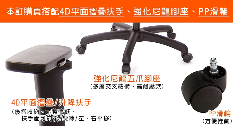 本訂購頁規格:4D"平面"摺疊/升降扶手、尼龍腳座、PP滑輪