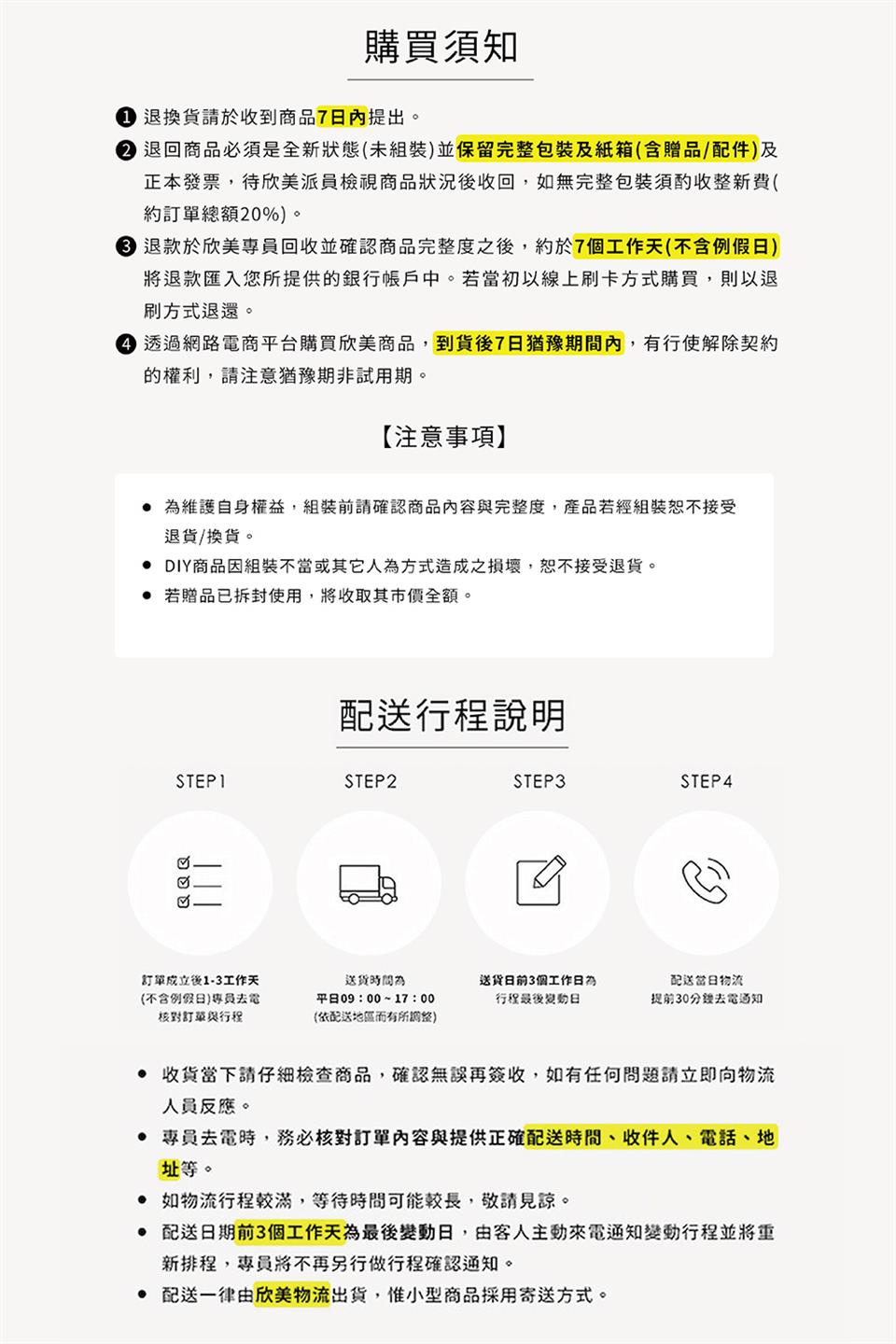 3.溫馨提醒,鑑賞期非試用期,商品經組裝後恕不接受退貨,敬請確認商品是否符合需求並確認商品無瑕庛問題後再組裝與使用。