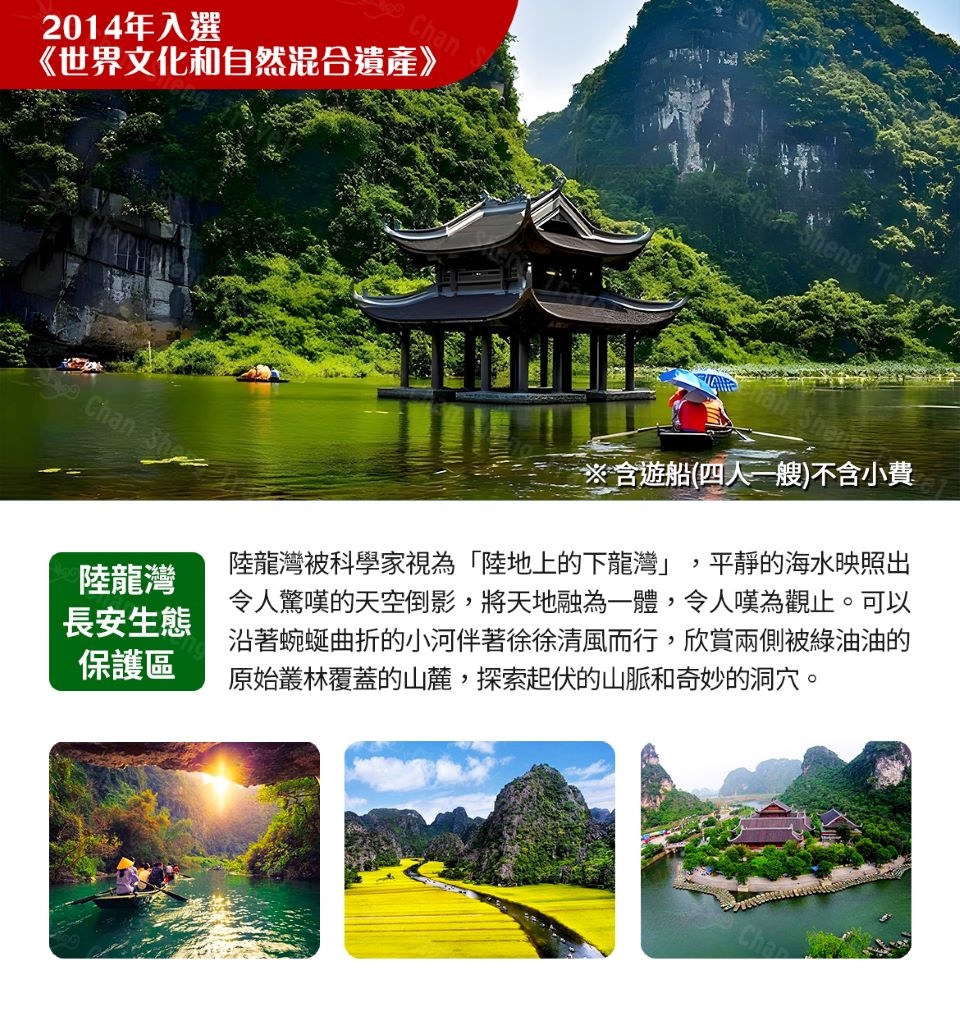 【長安生態保護區遊船(四人一艘)不含小費】寧靜的曲折小河蜿蜒其中徐徐清風而行,綠油油的原始叢林覆蓋山麓、石灰岩地形所形成的奇峰異石風光明媚。沿河畔兩岸風景比下龍灣有過之而無不及,偶見小屋,遺世獨立,小舟在山石間浮遊,遠眺一座座孤聳怪立的山巒,讓人覺得彷彿進入深邃氛圍裡,緩緩的走進這塊世外桃源、清幽寧靜的幻夢奇境,讓人感覺沉浸在一股彷彿以世無爭與身體共譜出一首輕鬆悠哉的樂曲! 早餐:飯店享用 午餐:寧平羊肉風味餐 晚餐:園區活動,敬請自理 |