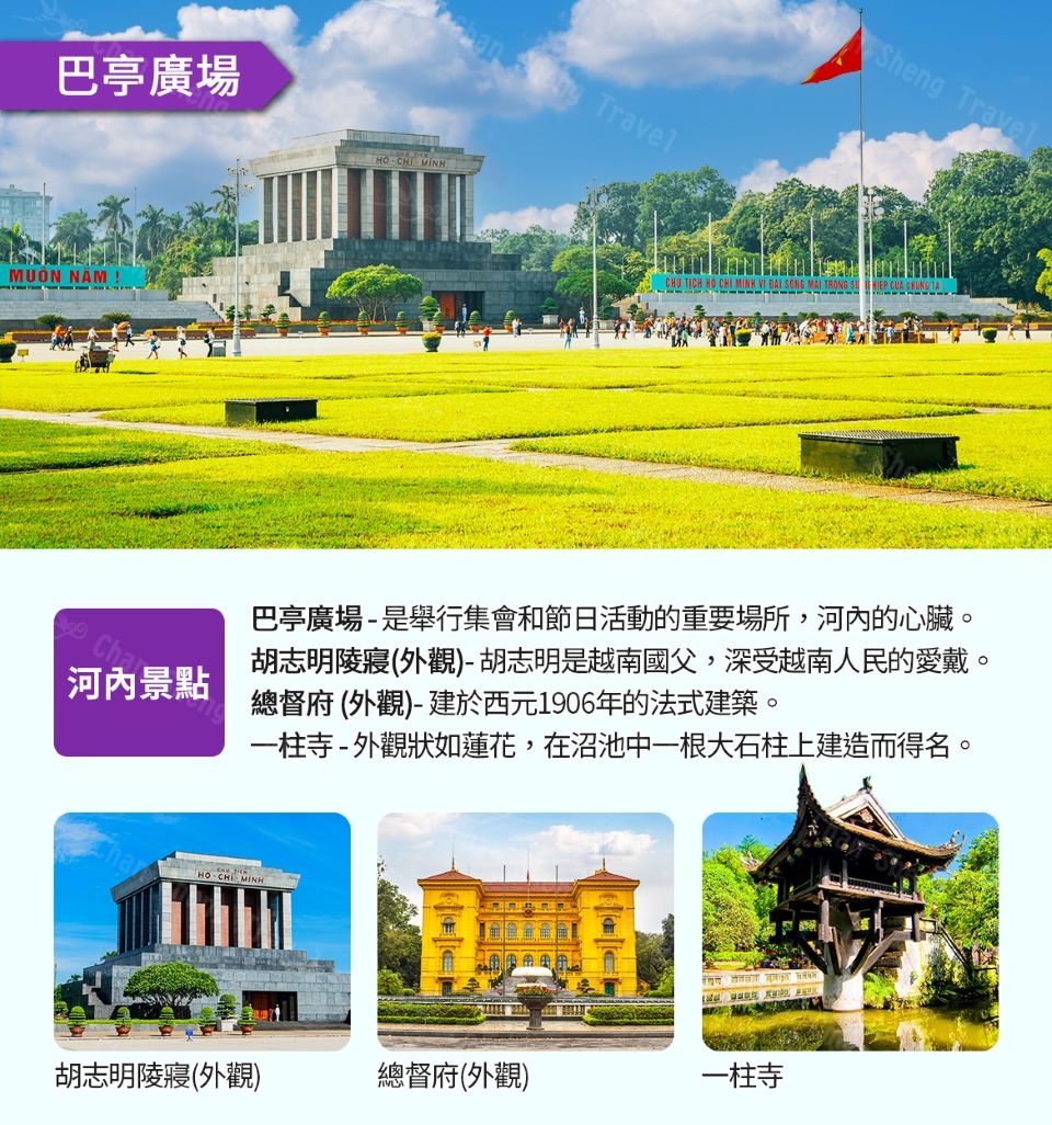 【巴亭廣場】是舉行集會和節日活動的重要場所。如果說首都河內是越南的心臟,那麼巴亭廣場可以河內的心臟。巴亭廣場位於市中心,還劍湖西北,廣場長320米,寬近100米,可容納一二十萬人,是河內人民集會和節日活動的場所。 早餐:飯店享用 午餐:蓮花自助餐 晚餐:下龍灣海鮮風味料理 |