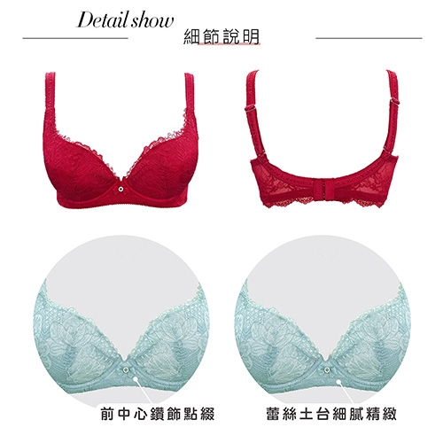 1. 罩杯—香雪蘭花漾蕾絲剪接設計,運用襯色突顯層次變化。
