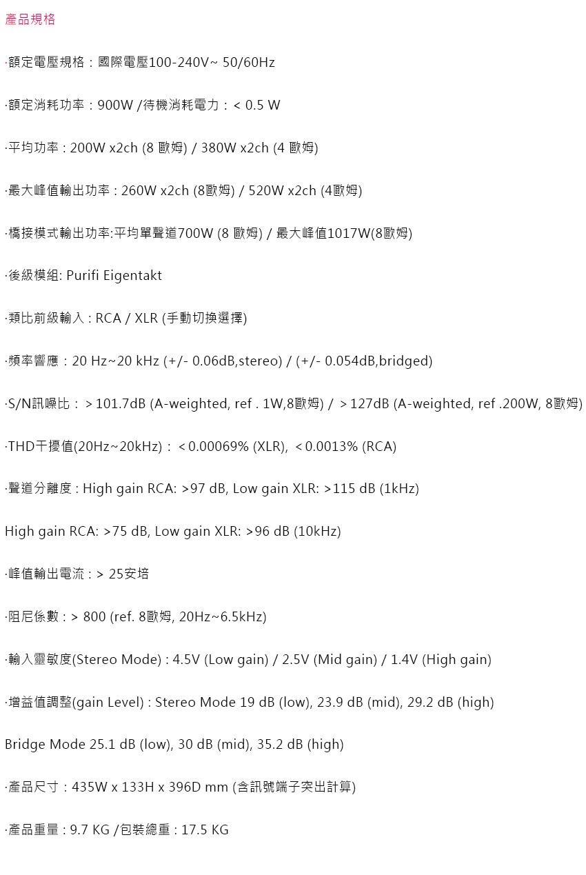 ‧連接前級,輸入提供RCA非平衡及XLR平衡各一組,需切換選擇