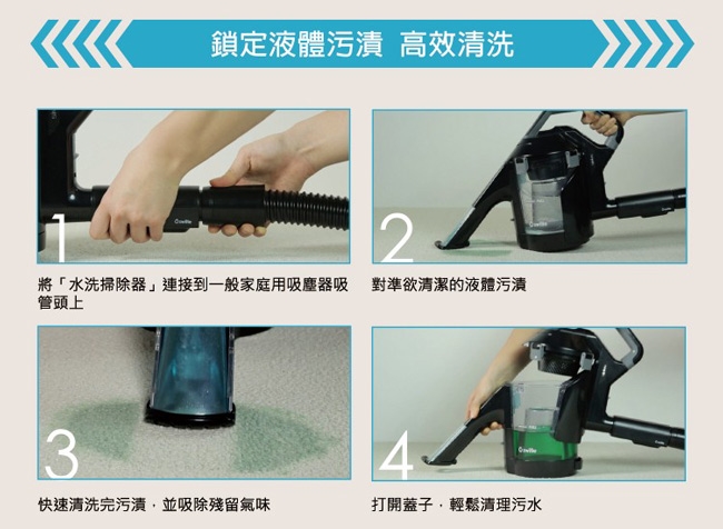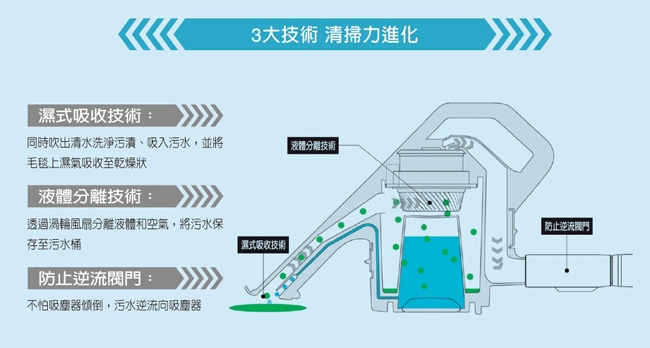 ◎專利濕式吸收技術,噴出清水洗淨髒汙,迅速吸回汙水及濕氣