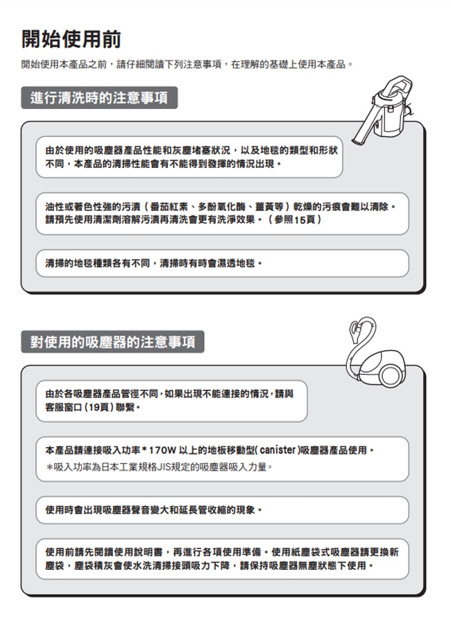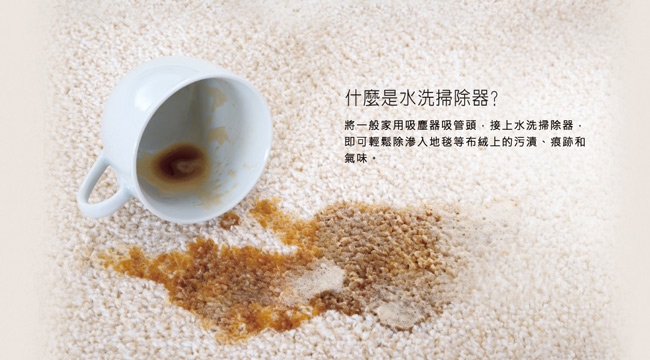 ◎搭配臥式(canister)吸塵器使用,適用於地毯、沙發等布絨上之汙漬清潔