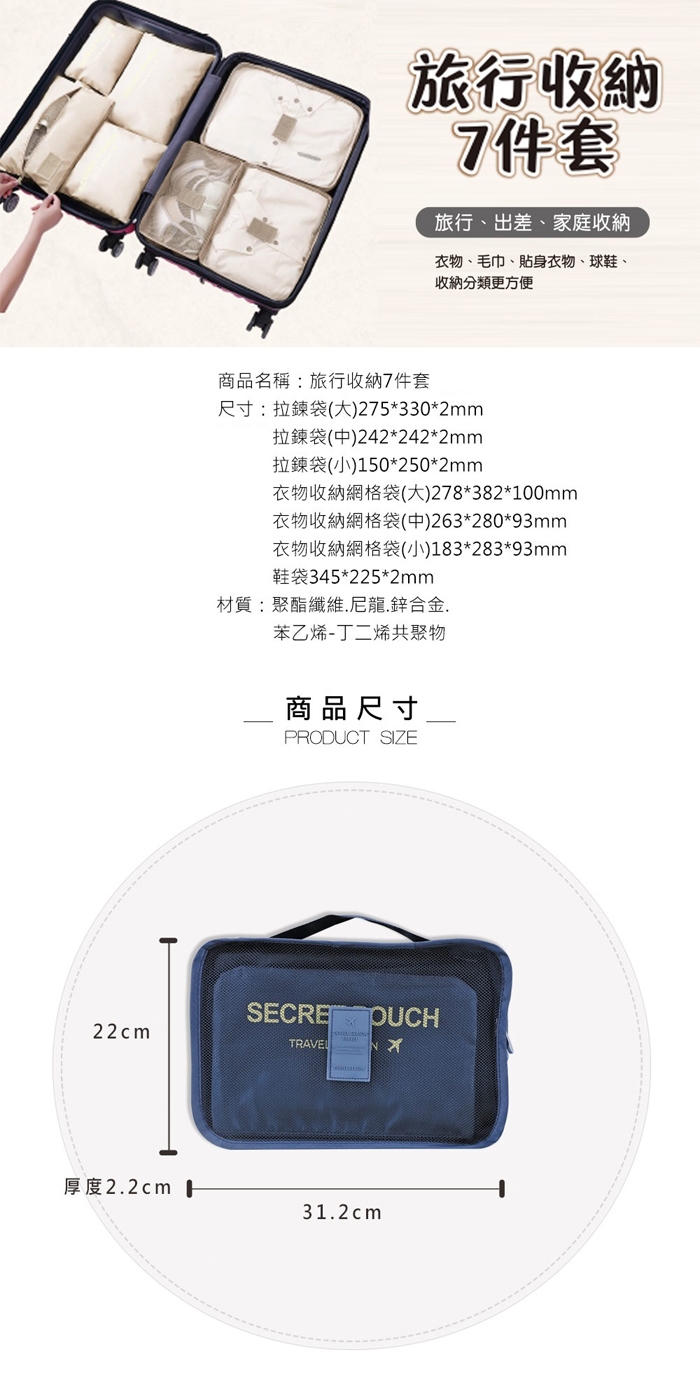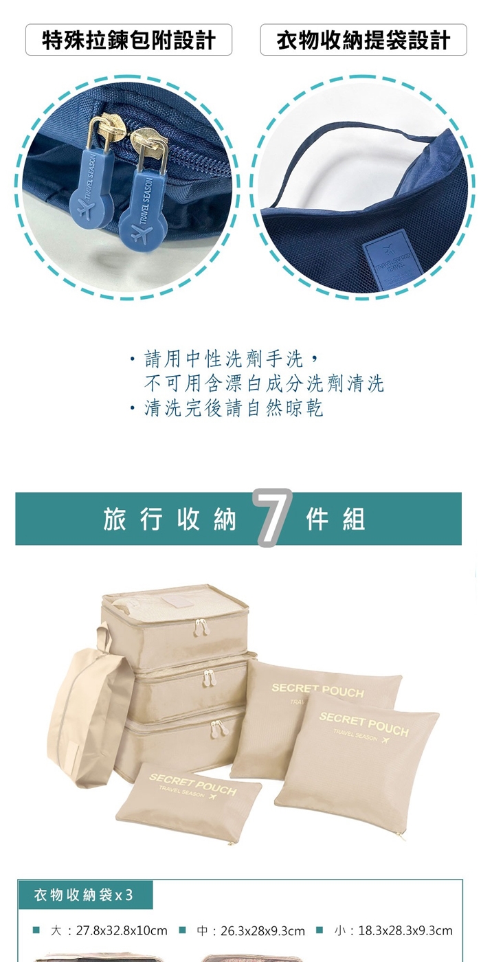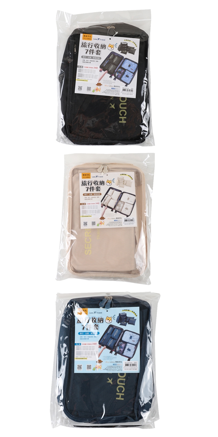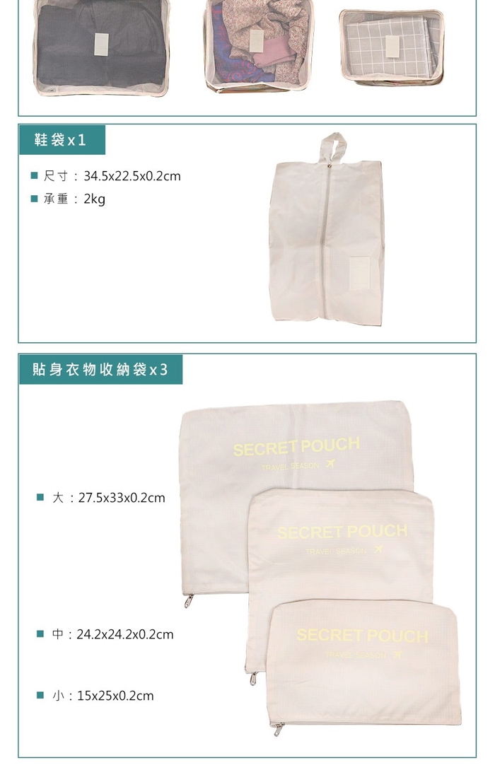 ★ 拉鍊袋(大/中/小)各1、衣物收納網格袋(大/中/小)各1、鞋袋