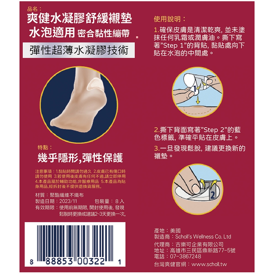 撕下寫著”Step 1”的背貼, 黏貼處向下貼在水泡的中間處。
