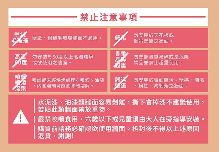 2.勿安裝於表面髒污、壁癌、潮濕、壁紙、毛玻璃或易剝落之牆面。