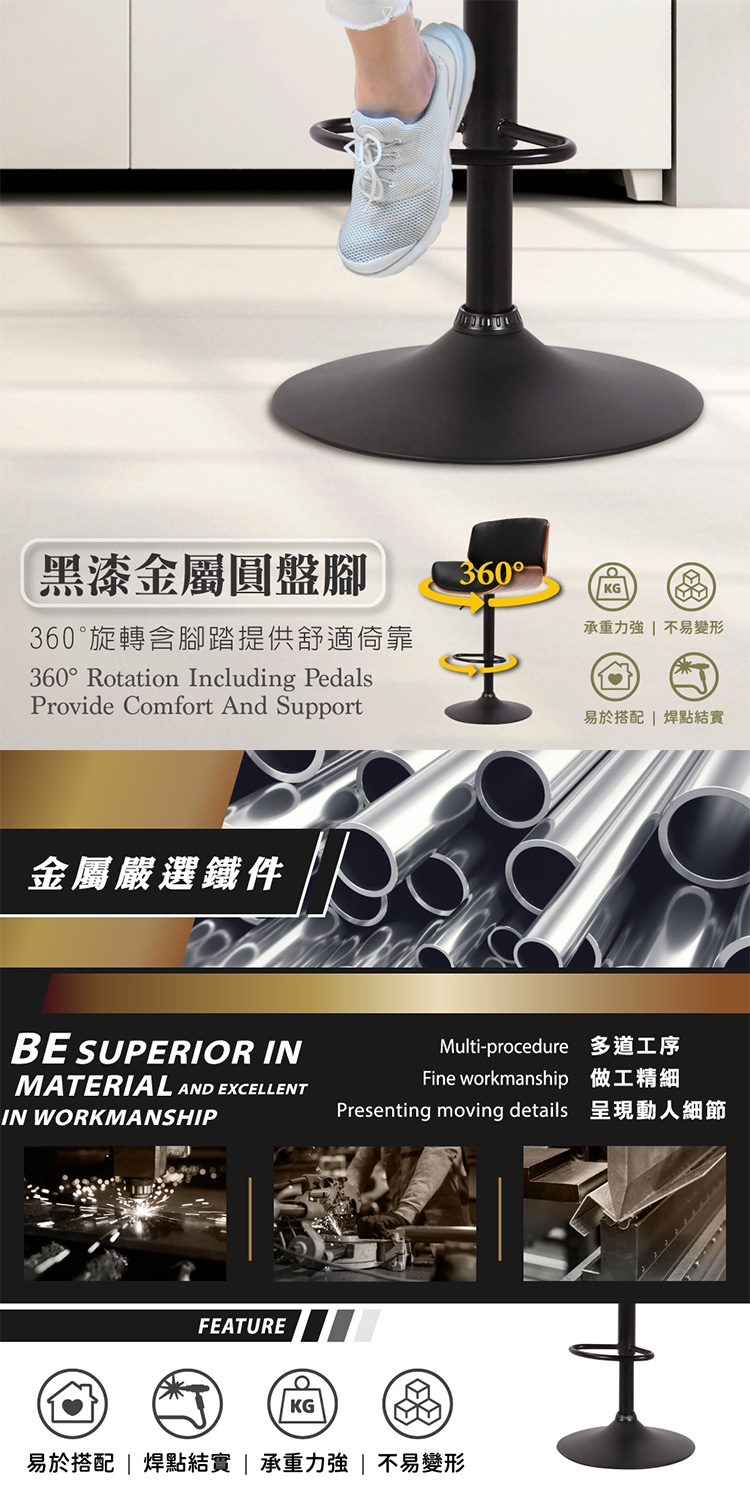 黑漆金屬圓盤腳、穩定且承重強,易於搭配的顏色為空間注入創意,可配合吧檯或中島,享受完全的機動性。