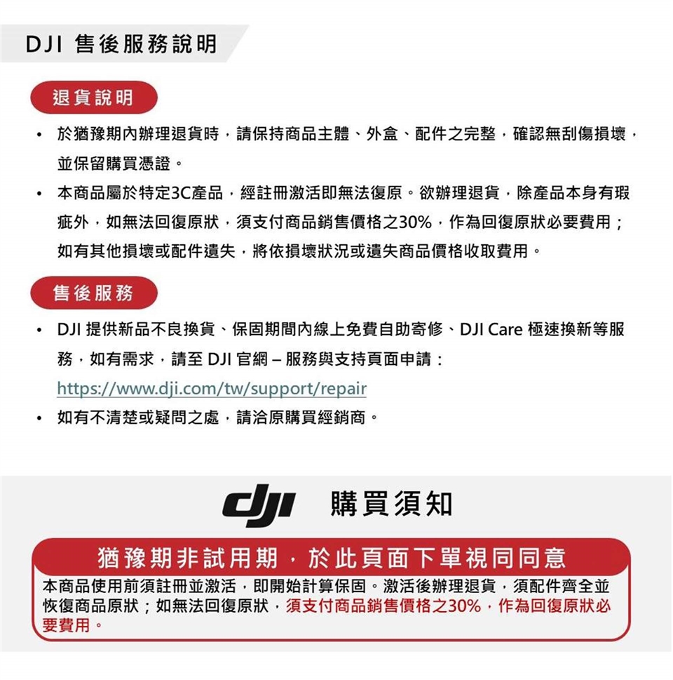商品到貨享猶豫期之權益(注意!猶豫期非試用期),辦理退貨商品必須是全新狀態且包裝完整,否則將會影響退貨權限。 本商品一經拆封註冊無法退貨!