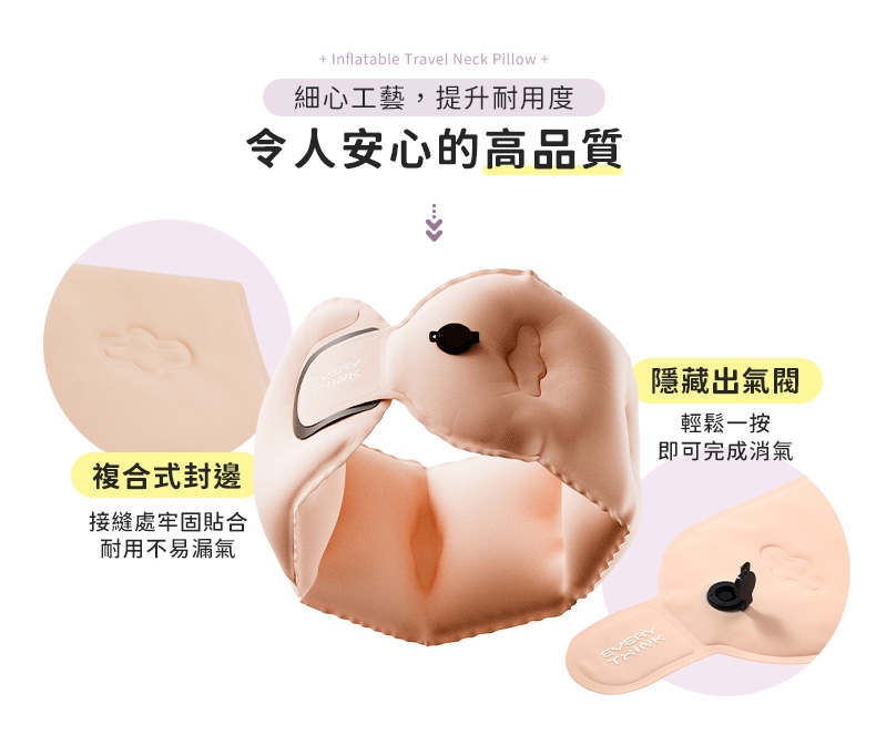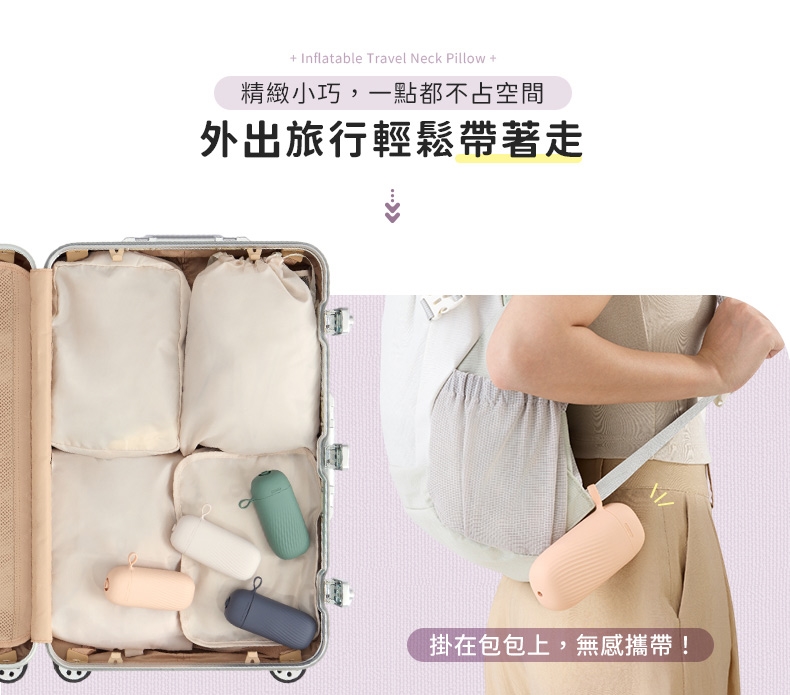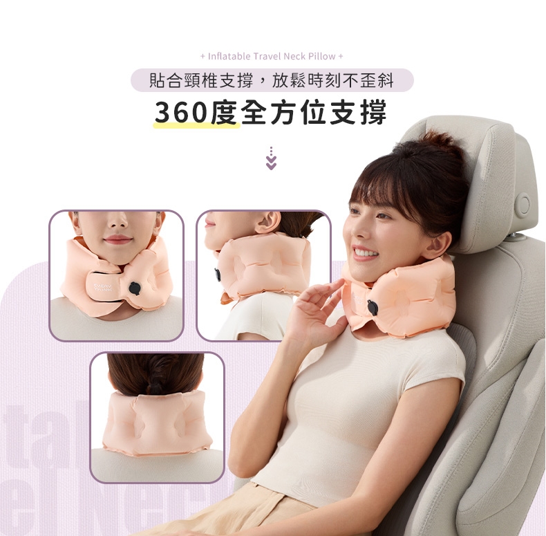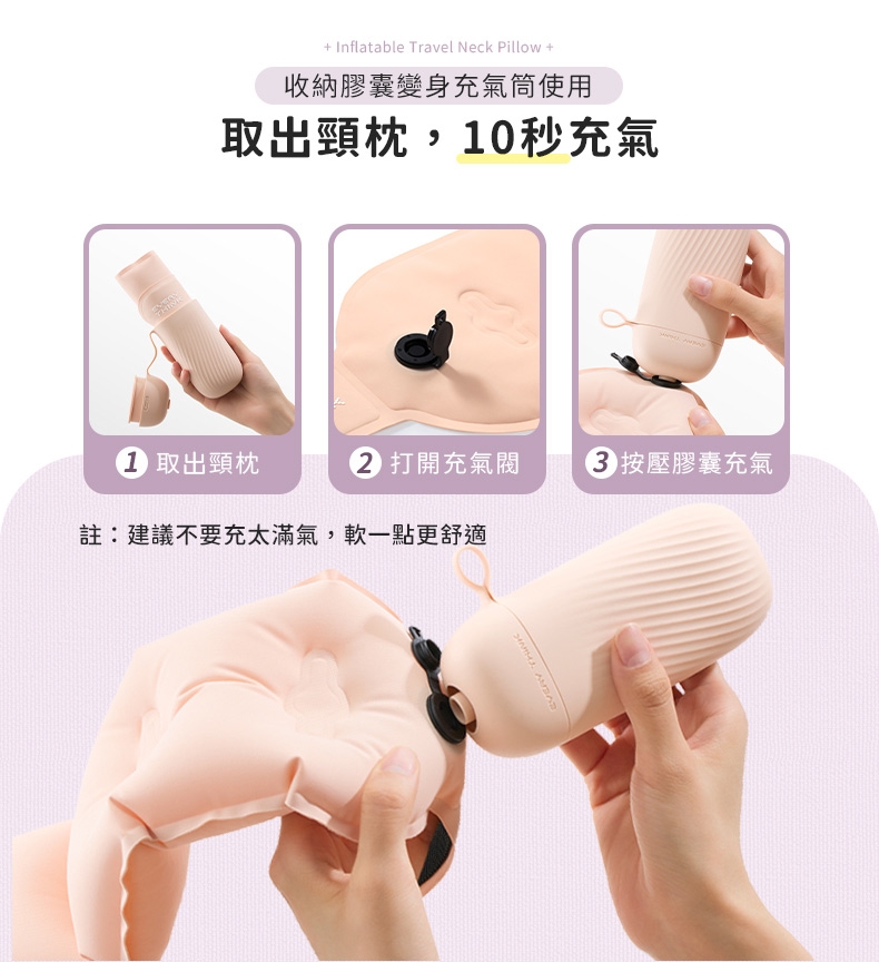 2. 搭飛機使用充氣式枕頭/頸枕時,建議於起飛前將枕頭/頸枕吹至6分滿即可。飛機起飛升空後,枕頭/頸枕受到機艙的壓力會再膨脹;或於飛機升空後再進行充氣;以上可避免充氣式枕頭/頸枕漏氣而損壞。