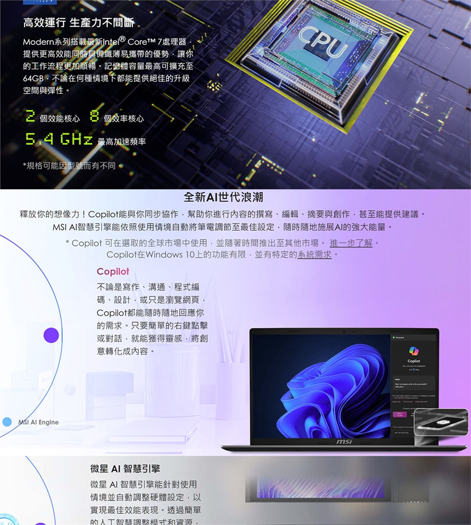 | 處理器 | Intel® Core™ 7 processor 150U 10 cores (2 P-cores + 8 E-cores), Max Turbo Frequency 5.4 GHz |