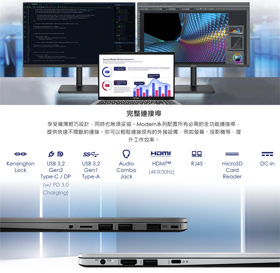 | 介面 | 1x Mic-in/Headphone-out Combo Jack 1x Type-C (USB3.2 Gen2 / DisplayPort™/ Power Delivery 3.0) 3x Type-A USB3.2 Gen1 1x Micro SD Card Reader 1x HDMI™ (4K @ 30Hz) |