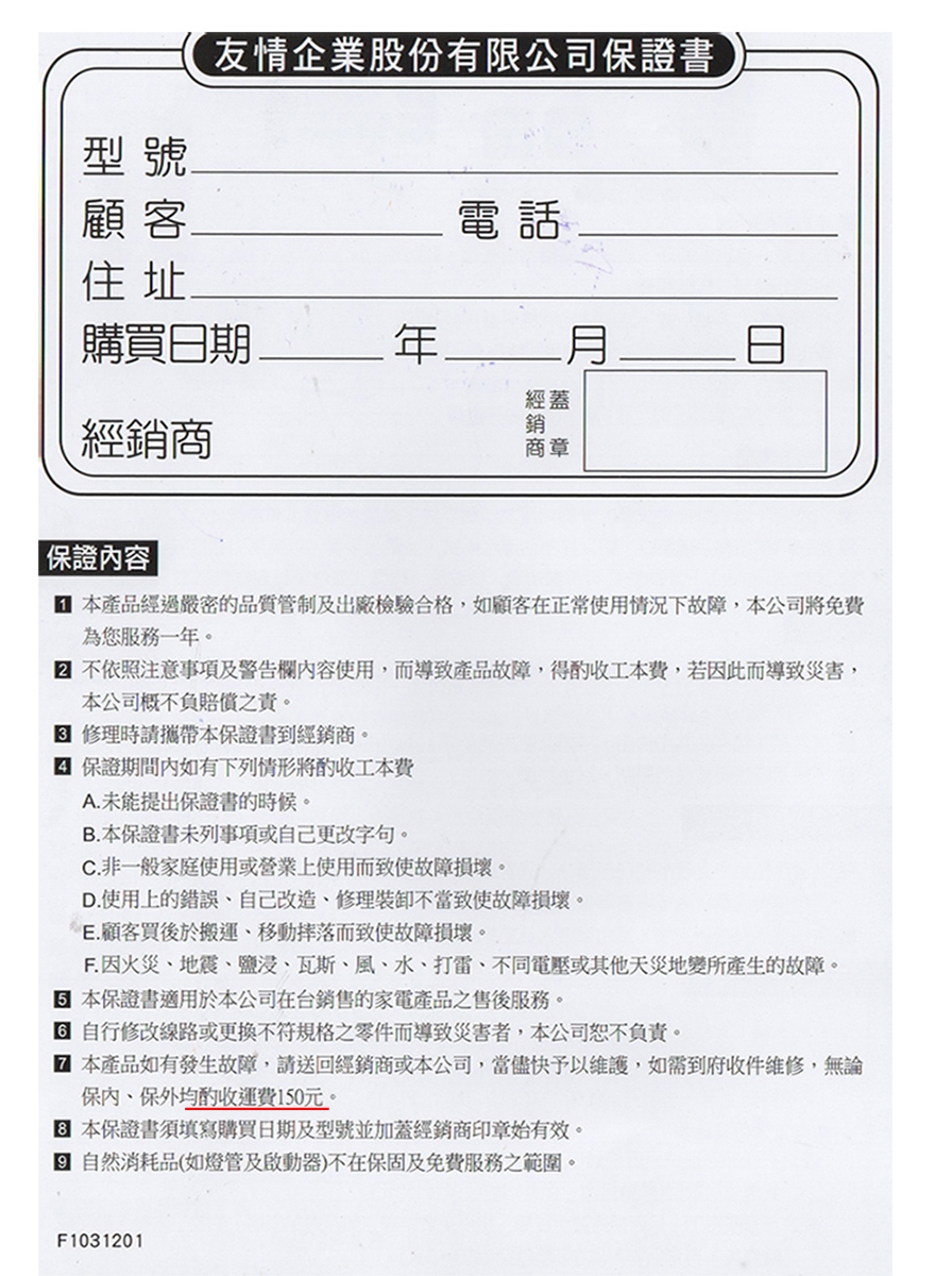 2、本產品無提供到府服務請自行送修,或由本工司委派物流公司到府取件,不論保內外均酌收150元運費。