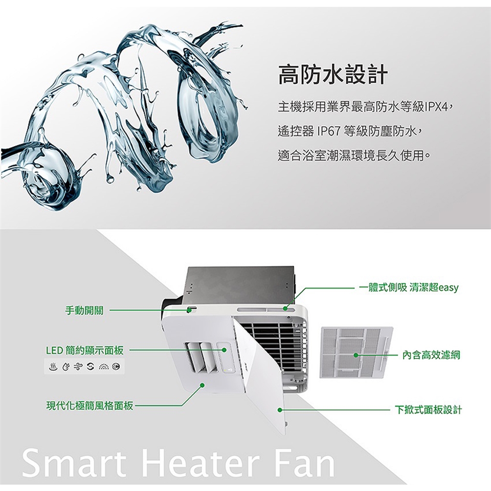 主機 IP X4 ,遙控器 IP67 等級防塵防水,適合浴室潮濕環境長久使用。