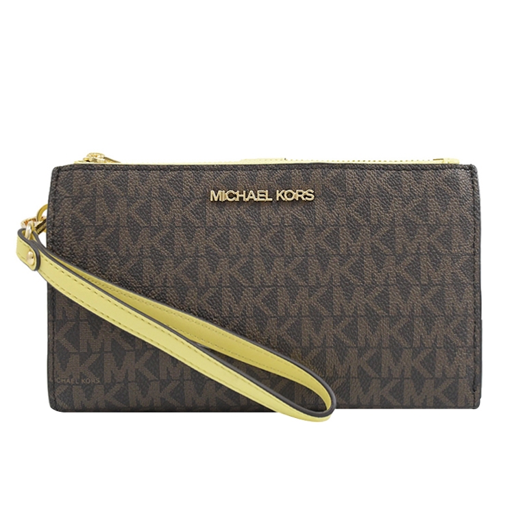 MICHAEL KORS 品牌(簡稱MK)成立於 1981 年是美國設計師同名的品牌;此款是專櫃熱銷手拿雙拉鍊中長夾,可當手拿包使用,採用滿版LOGO印花 PVC加上經典浮雕LOGO,扣式開口/內6信用卡夾+1透明夾層+2夾層+1放5.5吋手機夾層+1鈔票夾+2拉鍊零錢袋,釋放都會簡約風格,兼具典雅時尚氣質。