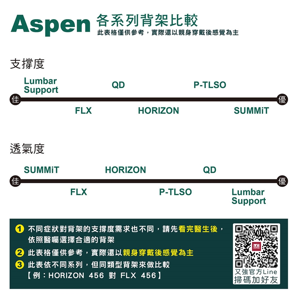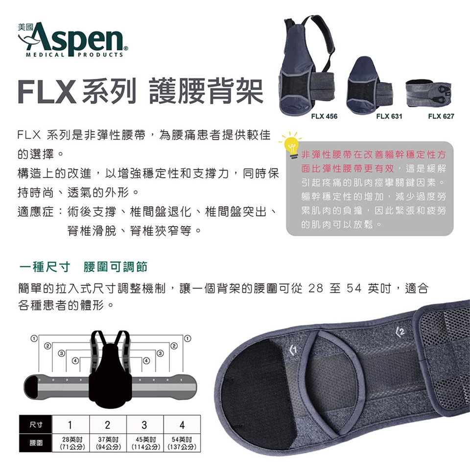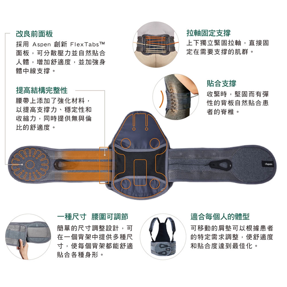 Aspen FLX 系列是非彈性背架,為腰痛患者提供較佳的選擇。