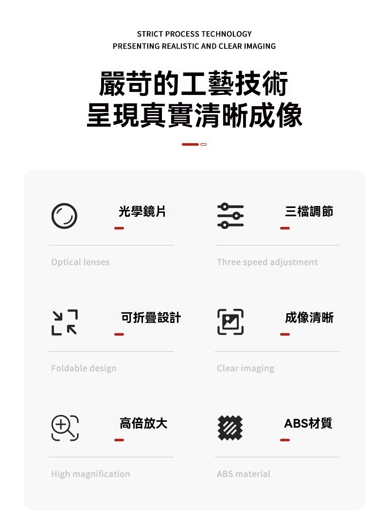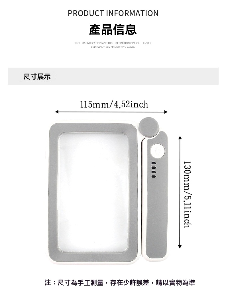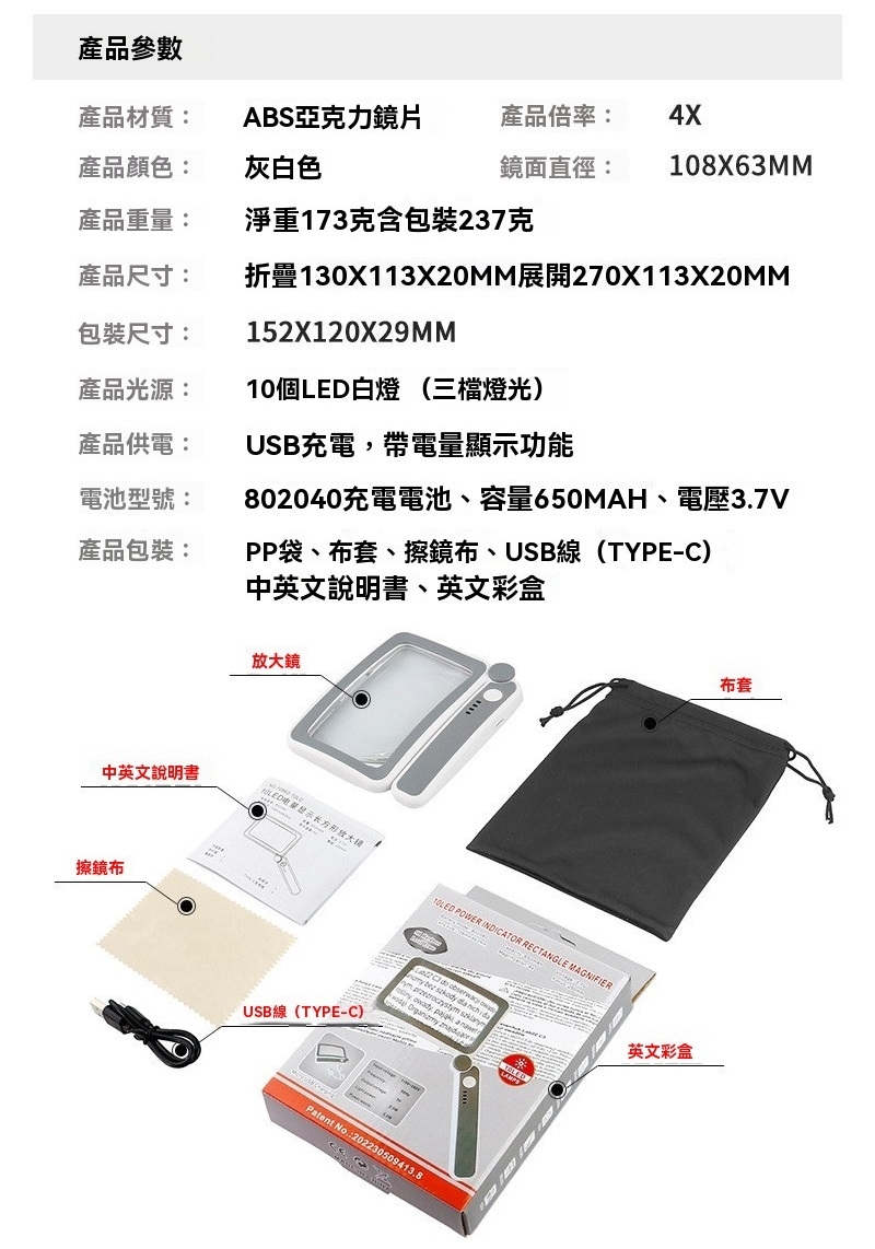 產品內容:放大鏡、布套、擦鏡布、USB線(TYPE-C)、中英文說明書、英文彩盒