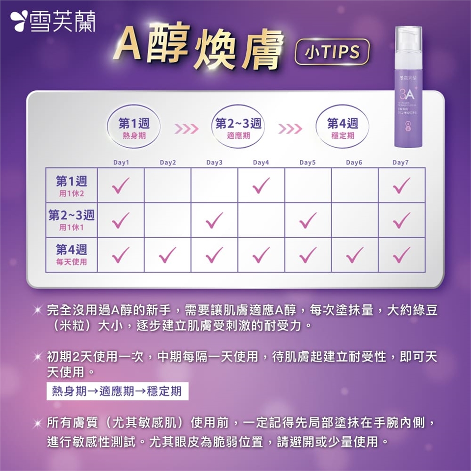 超級A醇,能改善痘肌、淡化皺紋、調理毛孔,超優秀的撫紋抗皺力,使肌膚表面更緊實光滑。