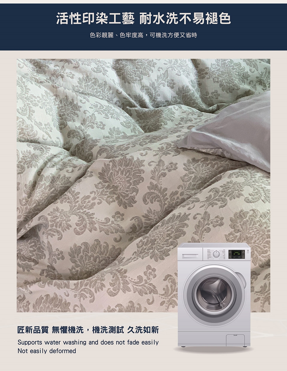 ◆ 採100%純棉紗線,經過特別處理後使織物色調柔和、親膚柔軟。