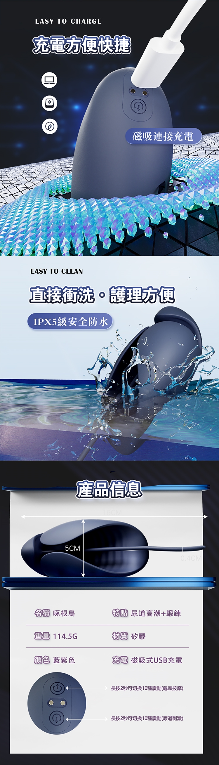 - 尿道震顫:獨特震動設計,從尿道到龜頭,全方位的震顫與悸動感,讓快感持續升級。