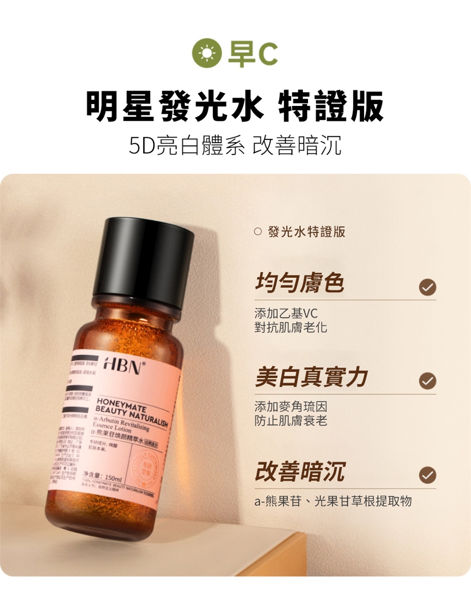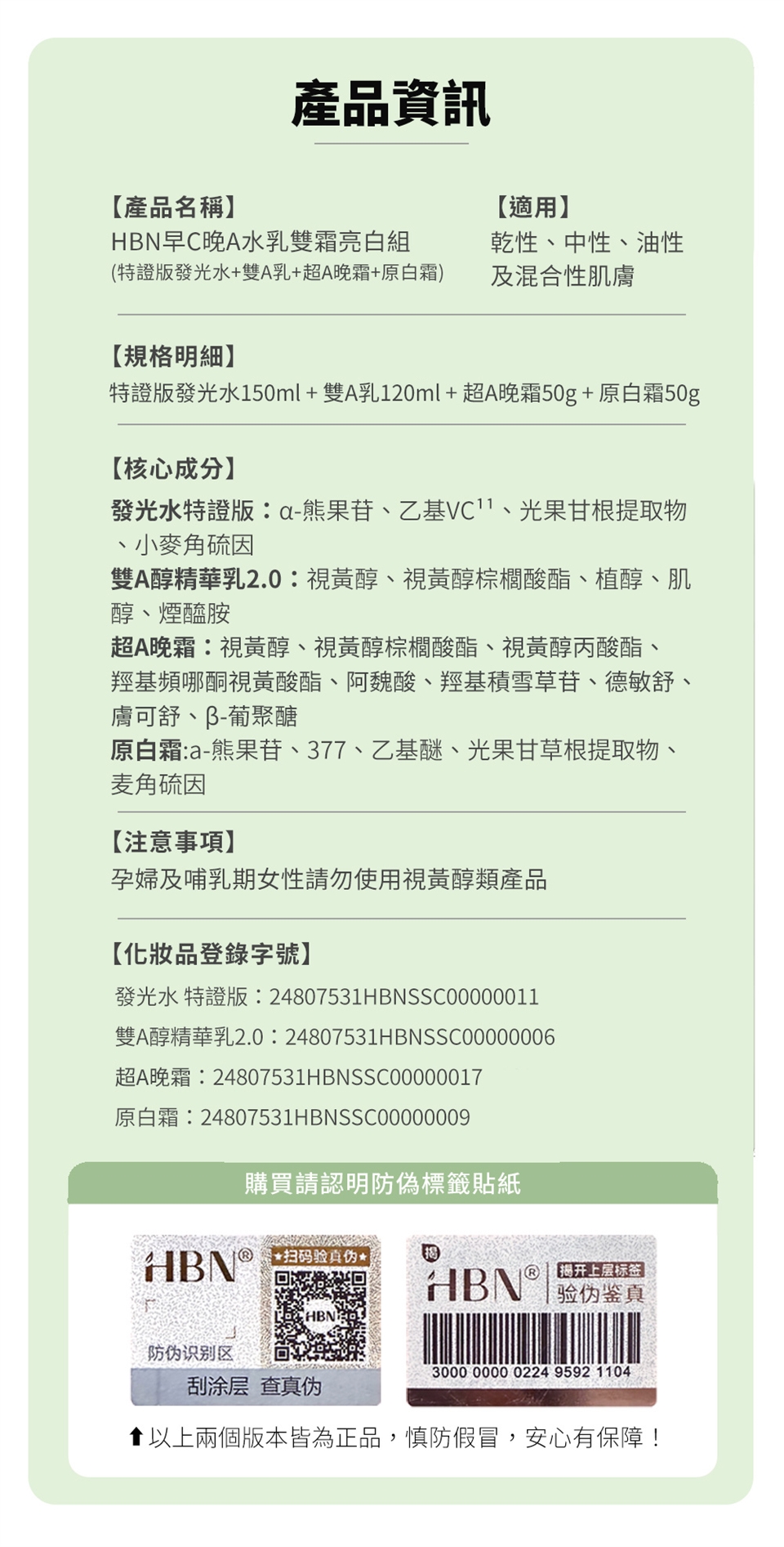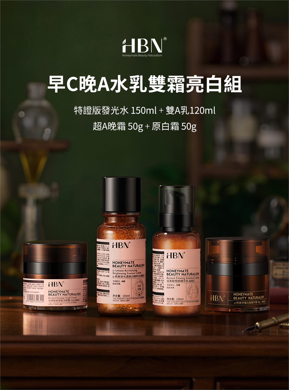品名:【HBN官方】早C晚A水乳雙霜亮白組 (特證版發光水+雙A乳+超A晚霜+原白霜)