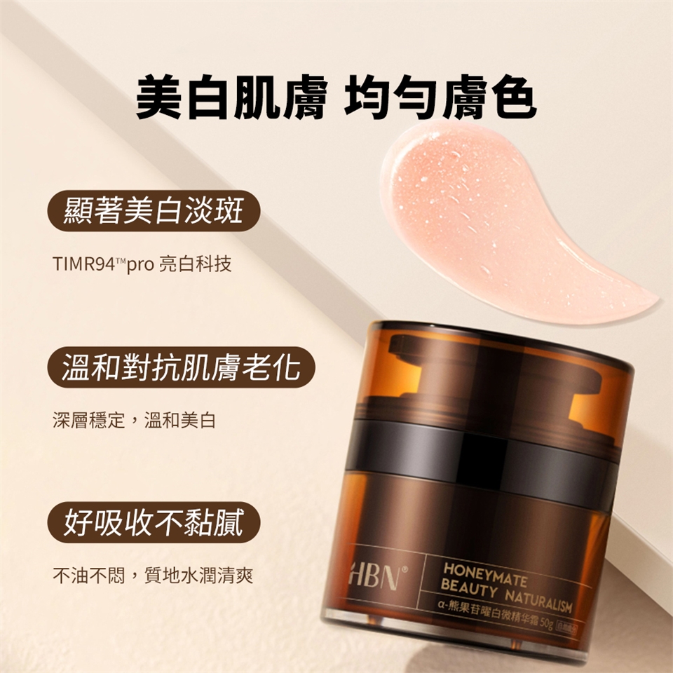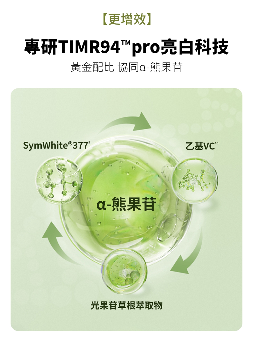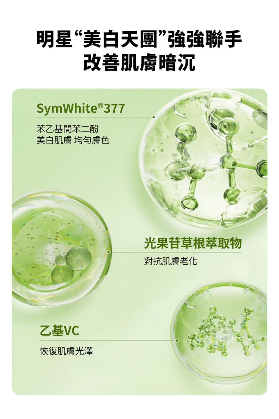 主要成分 : α-熊果苷、乙基VC、光果苷草根萃取物、傳明酸、雪絨花萃取物、長心卡帕藻萃取物、德敏舒