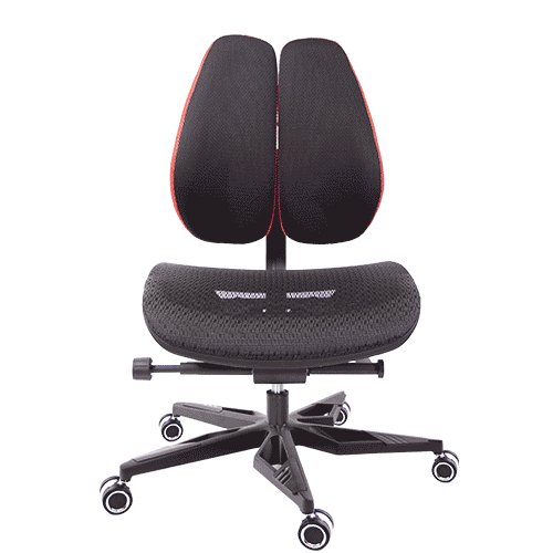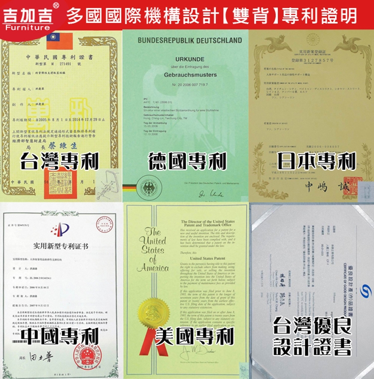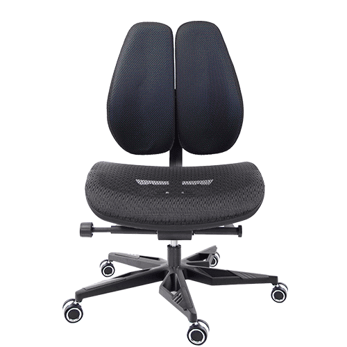 人體工學雙背設計,改善長時間座在椅子上,覺得腰部貼合度不足,有懸空或不夠沉穩的感覺,改良式的雙背背墊,除了完整包覆性外,更提供了『左右彈性』、『上下貼合』、『彈力緩衝』等特性,並有多國國際結構專利認證(台灣、德國、日本、美國、中國等),原廠專利、技術100% Made in Taiwan台灣製造。