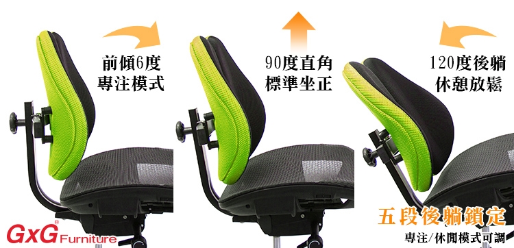 5段鎖定前傾6度一段、90度直角坐正、放鬆後躺3個段落鎖定,後躺最大角度約40度。